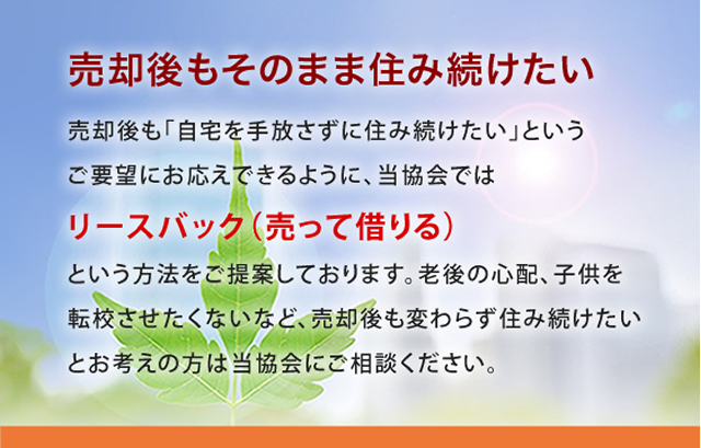 ローンが支払えず住み慣れた我が家にどうしても住み続けたい、思ったより退職金や年金が少なく今後の生活に不安、自宅を残しても相続させる人がいない、子供を転校させたくない。そんな方はリースバックをおすすめします。